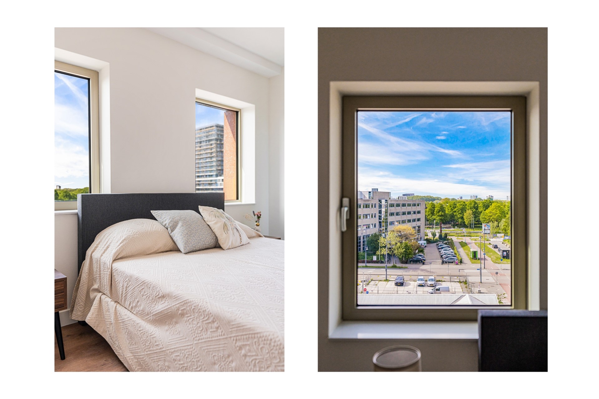 Vanuit de slaapkamer loopt u door naar de open keuken, die is uitgerust met diverse inbouwapparatuur en voldoende werkruimte. De keuken staat in open verbinding met de lichte en ruime woonkamer, waar grote ramen zorgen voor een prettige hoeveelheid daglicht en een uitnodigende sfeer.