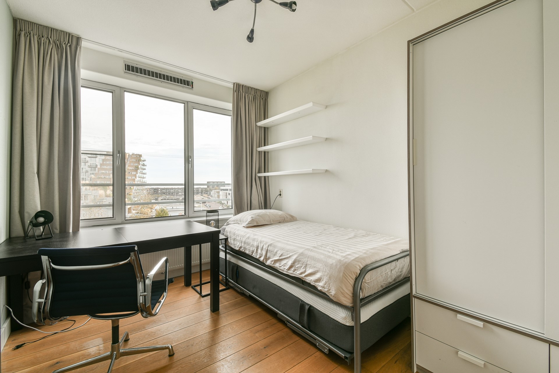 Building equipped with elevator. The apartment is located on the top floor. Central hall, two equally spacious bedrooms, modern bathroom with shower and sink. Separate toilet. Spacious living room with open kitchen, equipped with built-in appliances such as a dishwasher, fridge and oven. Sunny loggia to enjoy the views overlooking the water of 't IJ.