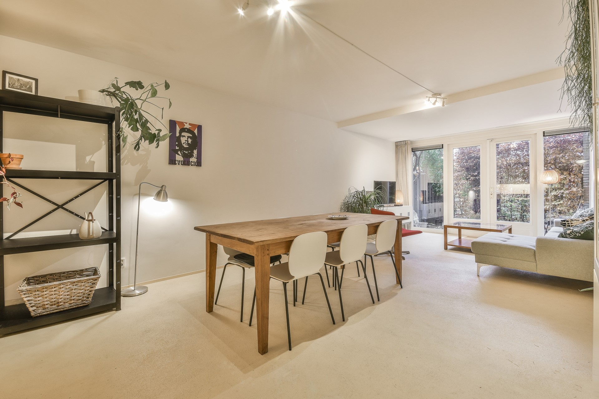 The spacious living room features a comfortable seating area and a large dining table, and is openly connected to the modern kitchen, which is equipped with various built-in appliances. From the living room, there is direct access to the garden, where an outdoor dining table allows for pleasant seating.