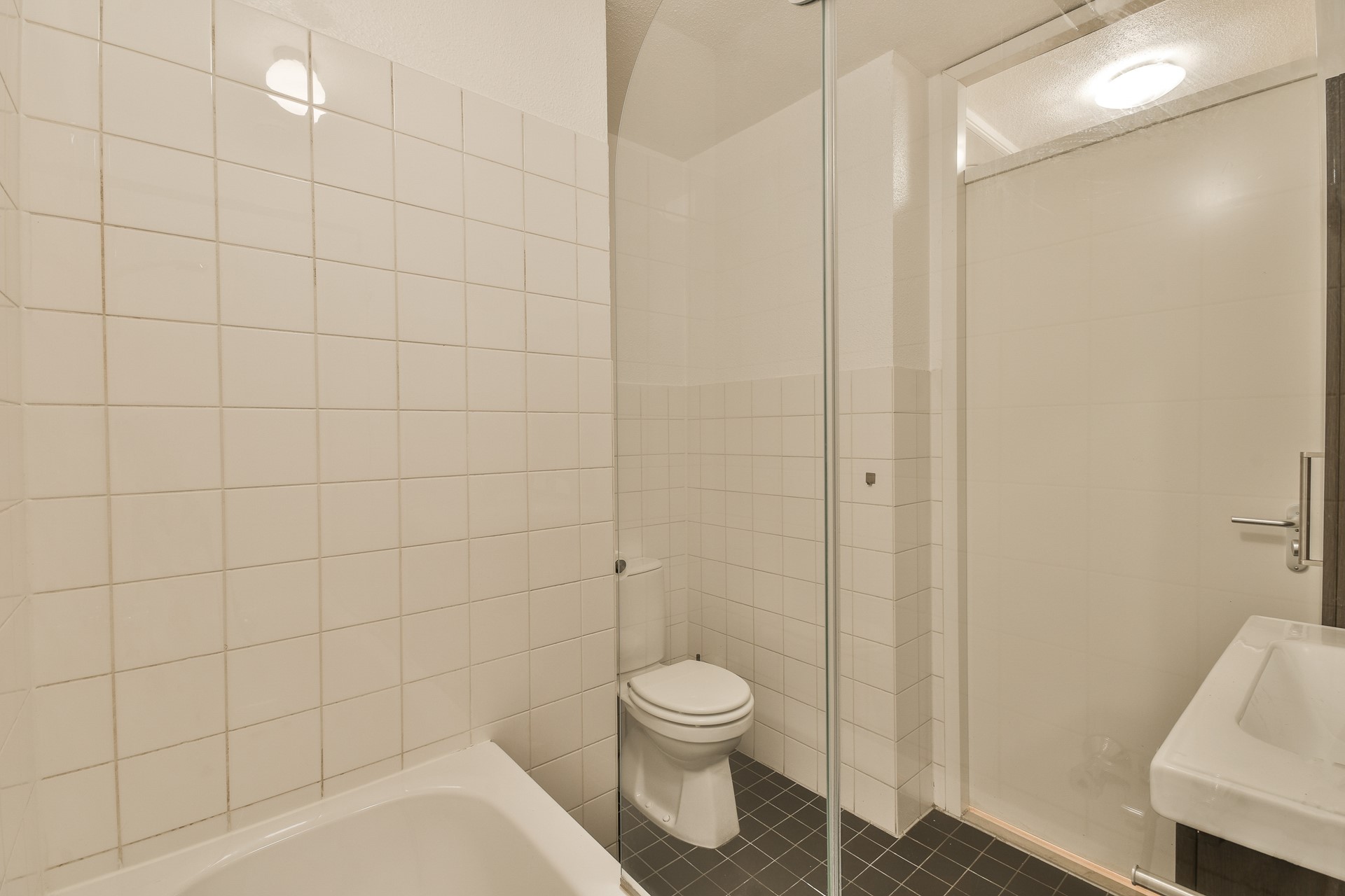 De moderne badkamer beschikt over een ligbad, wastafel(meubel) en toilet. Daarnaast is er een separaat tweede toilet en een aparte wasruimte met berging. De derde slaapkamer grenst aan de woonkamer.