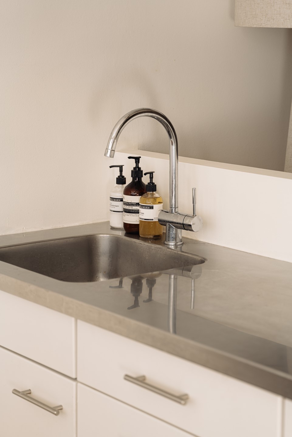 Upon entering, you step directly into the open kitchen with dining area. The front façade can be fully opened, allowing you to bring the outdoors in during the summer months. The kitchen is fitted with all necessary built-in appliances, including a four-burner gas hob, extractor fan, dishwasher, and fridge/freezer combination.